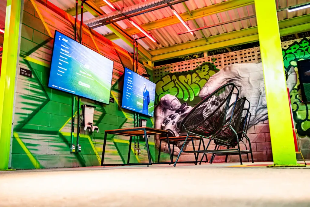 Nossa área gamer conta com videogame de última geração, jogos como FIFA e ambiente preparado pra todo mundo entrar no clima — seja jogando, torcendo ou resenhando.
